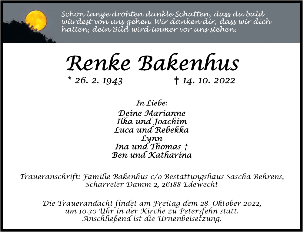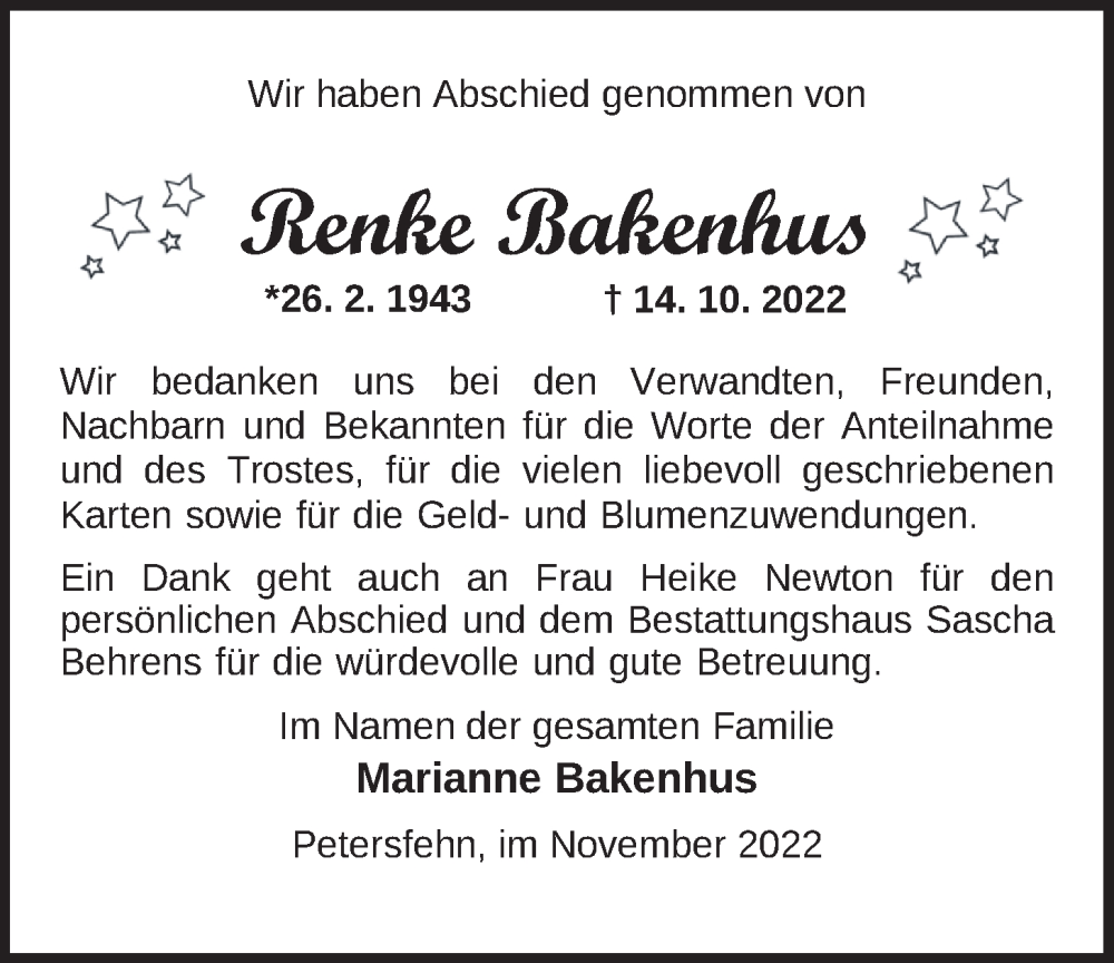 Hier finden Sie alle Traueranzeigen aus der Zeitung, die bisher für Renke Bakenhus erschienen sind. Weitere Traueranzeigen, die in der Zeitung erscheinen, werden hier ebenfalls aufgelistet