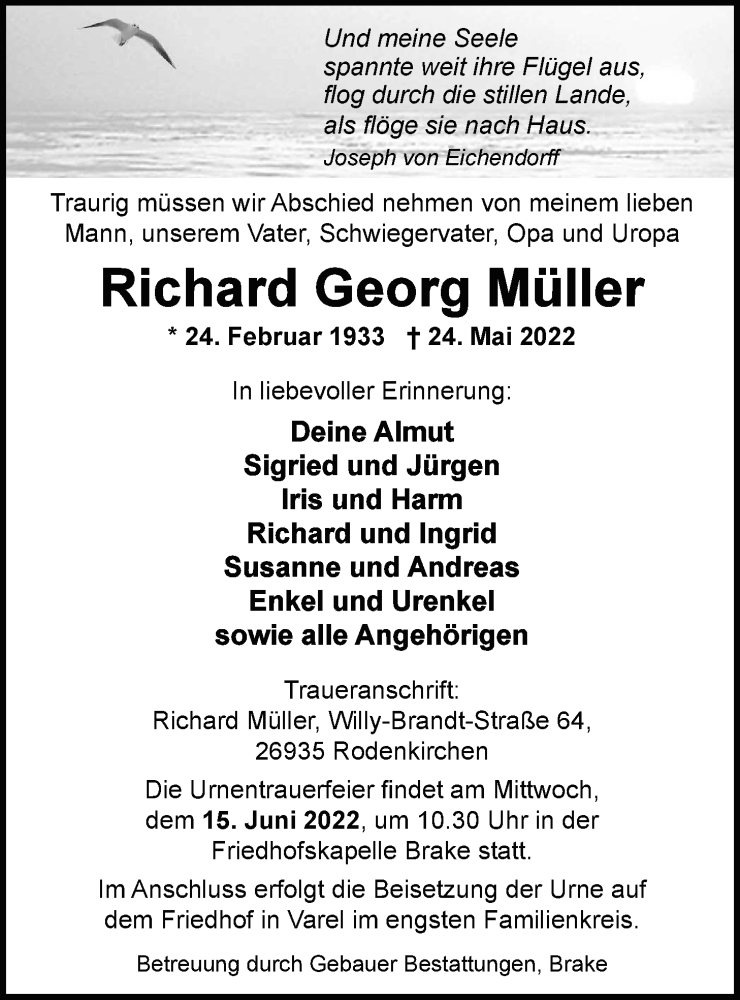 Hier finden Sie alle Traueranzeigen aus der Zeitung, die bisher für Richard Georg Müller erschienen sind. Weitere Traueranzeigen, die in der Zeitung erscheinen, werden hier ebenfalls aufgelistet
