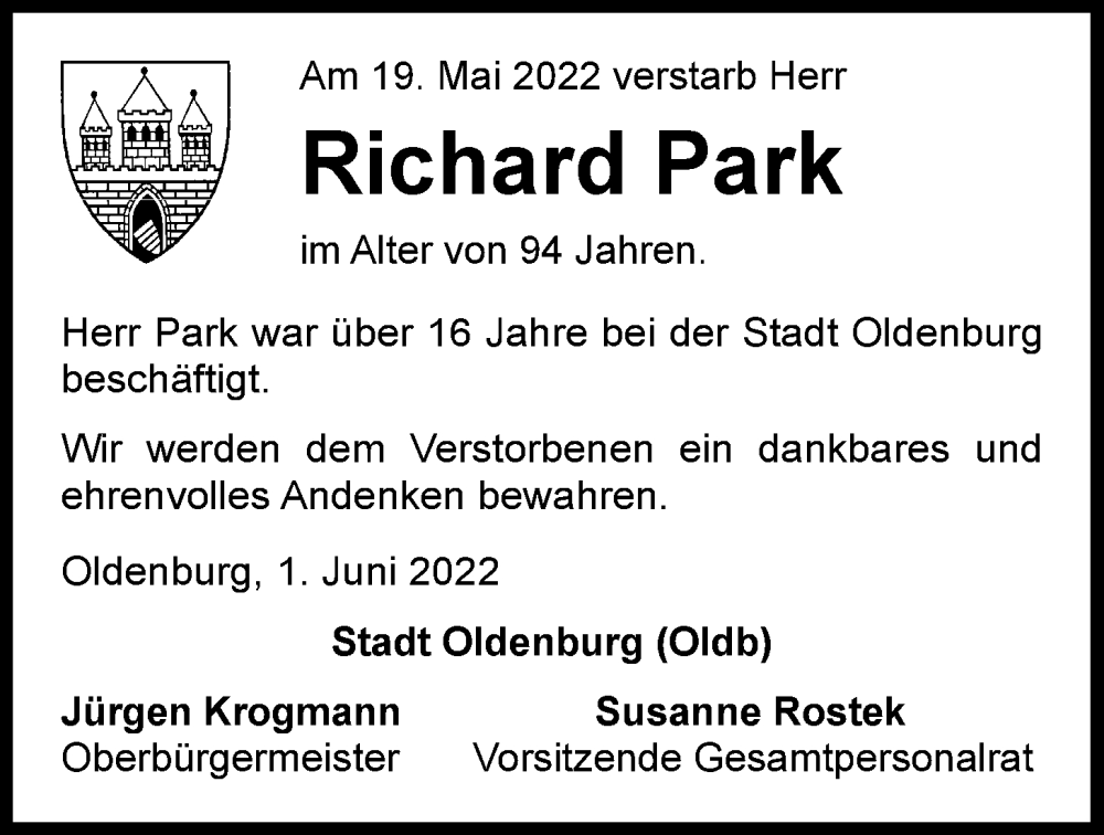 Hier finden Sie alle Traueranzeigen aus der Zeitung, die bisher für Richard Park erschienen sind. Weitere Traueranzeigen, die in der Zeitung erscheinen, werden hier ebenfalls aufgelistet