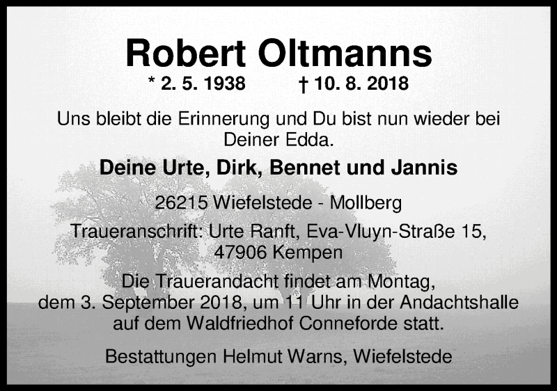 Hier finden Sie alle Traueranzeigen aus der Zeitung, die bisher für Robert Oltmanns erschienen sind. Weitere Traueranzeigen, die in der Zeitung erscheinen, werden hier ebenfalls aufgelistet