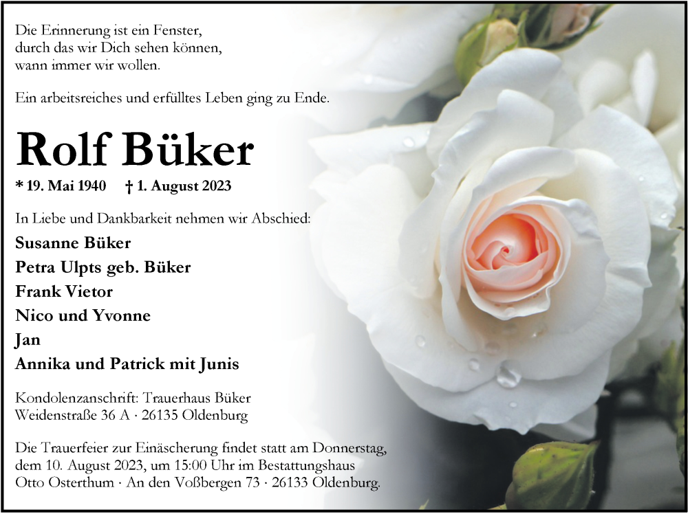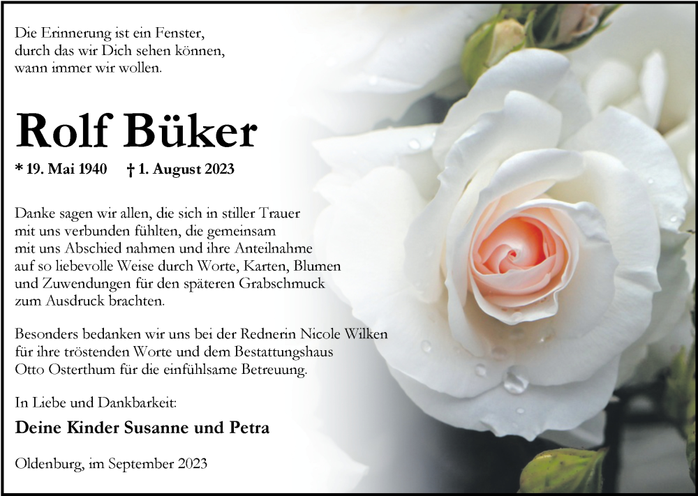 Hier finden Sie alle Traueranzeigen aus der Zeitung, die bisher für Rolf Büker erschienen sind. Weitere Traueranzeigen, die in der Zeitung erscheinen, werden hier ebenfalls aufgelistet