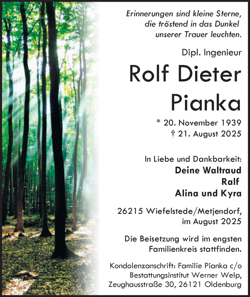 Hier finden Sie alle Traueranzeigen aus der Zeitung, die bisher für Rolf Dieter Pianka erschienen sind. Weitere Traueranzeigen, die in der Zeitung erscheinen, werden hier ebenfalls aufgelistet