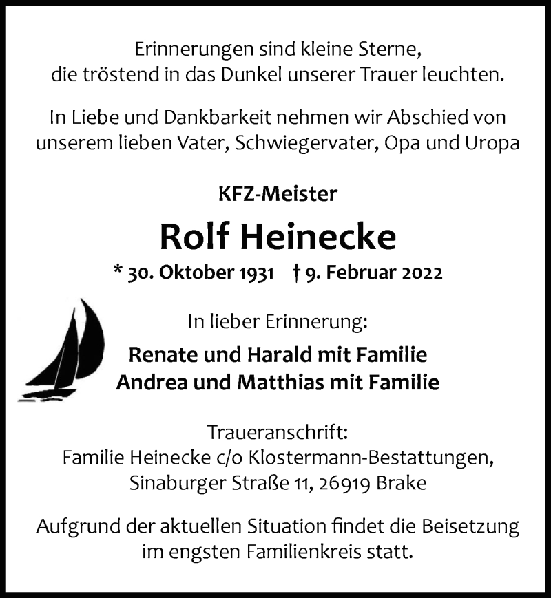 Hier finden Sie alle Traueranzeigen aus der Zeitung, die bisher für Rolf Heinecke erschienen sind. Weitere Traueranzeigen, die in der Zeitung erscheinen, werden hier ebenfalls aufgelistet