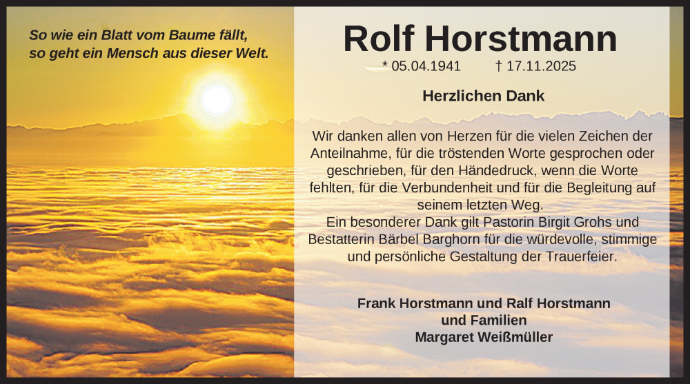 Hier finden Sie alle Traueranzeigen aus der Zeitung, die bisher für Rolf Horstmann erschienen sind. Weitere Traueranzeigen, die in der Zeitung erscheinen, werden hier ebenfalls aufgelistet