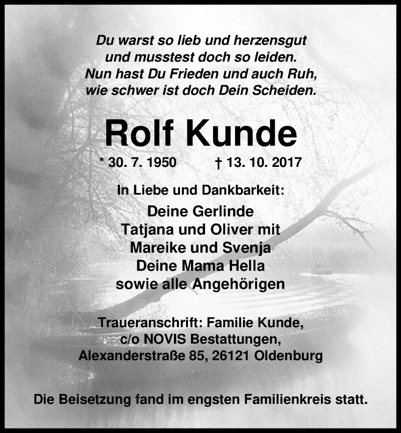 Hier finden Sie alle Traueranzeigen aus der Zeitung, die bisher für Rolf Kunde erschienen sind. Weitere Traueranzeigen, die in der Zeitung erscheinen, werden hier ebenfalls aufgelistet