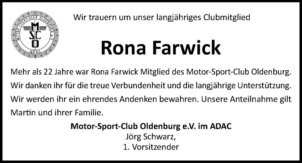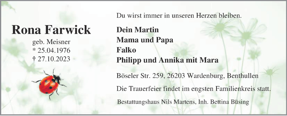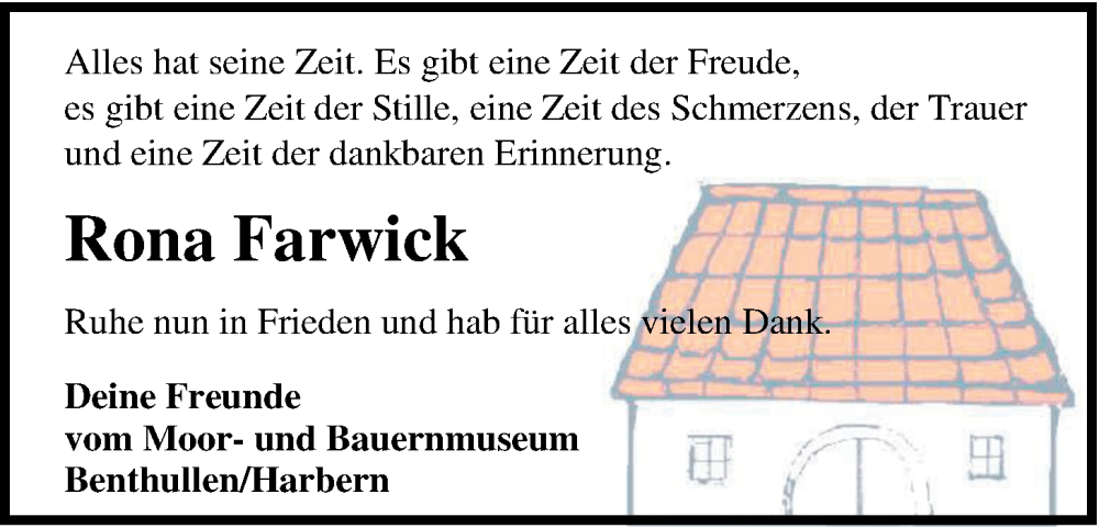 Hier finden Sie alle Traueranzeigen aus der Zeitung, die bisher für Rona Farwick erschienen sind. Weitere Traueranzeigen, die in der Zeitung erscheinen, werden hier ebenfalls aufgelistet
