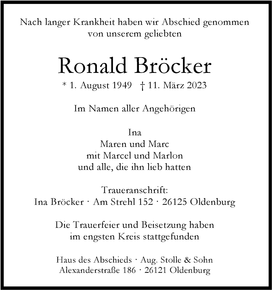 Hier finden Sie alle Traueranzeigen aus der Zeitung, die bisher für Ronald Bröcker erschienen sind. Weitere Traueranzeigen, die in der Zeitung erscheinen, werden hier ebenfalls aufgelistet