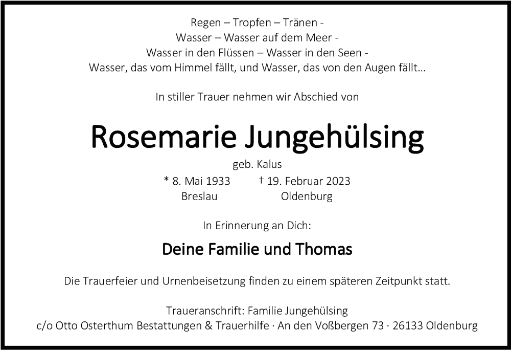 Hier finden Sie alle Traueranzeigen aus der Zeitung, die bisher für Rosemarie Jungehülsing erschienen sind. Weitere Traueranzeigen, die in der Zeitung erscheinen, werden hier ebenfalls aufgelistet