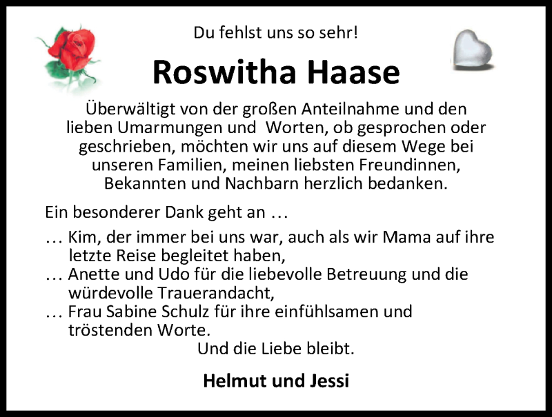Hier finden Sie alle Traueranzeigen aus der Zeitung, die bisher für Roswitha Haase erschienen sind. Weitere Traueranzeigen, die in der Zeitung erscheinen, werden hier ebenfalls aufgelistet