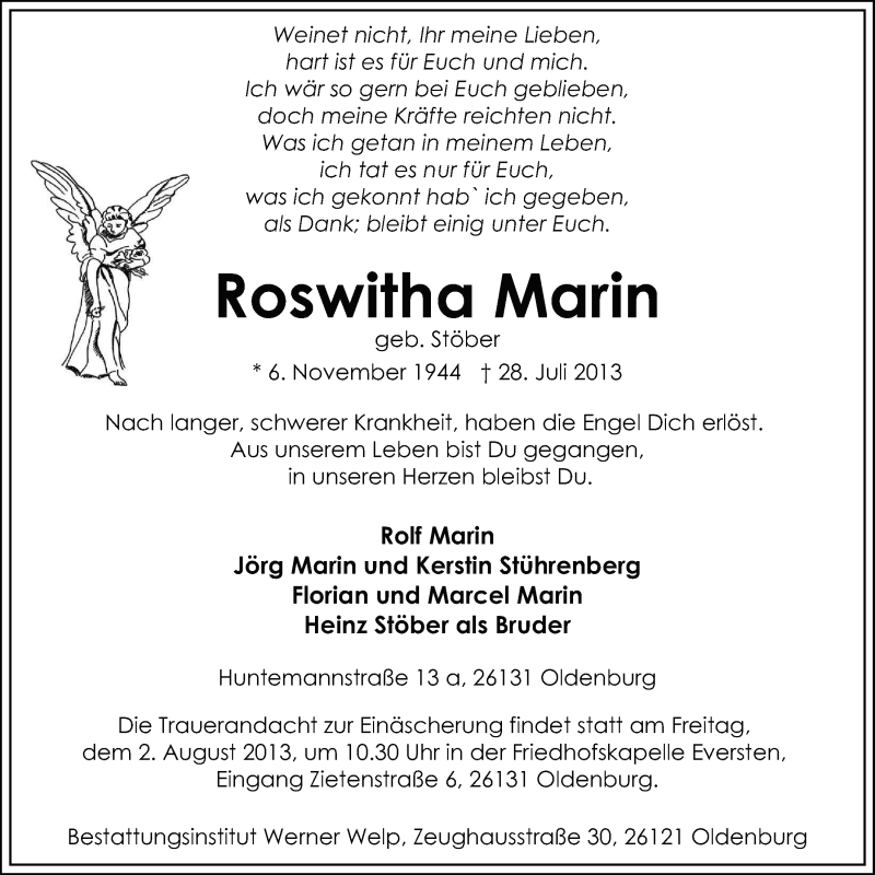 Hier finden Sie alle Traueranzeigen aus der Zeitung, die bisher für Roswitha Marin erschienen sind. Weitere Traueranzeigen, die in der Zeitung erscheinen, werden hier ebenfalls aufgelistet