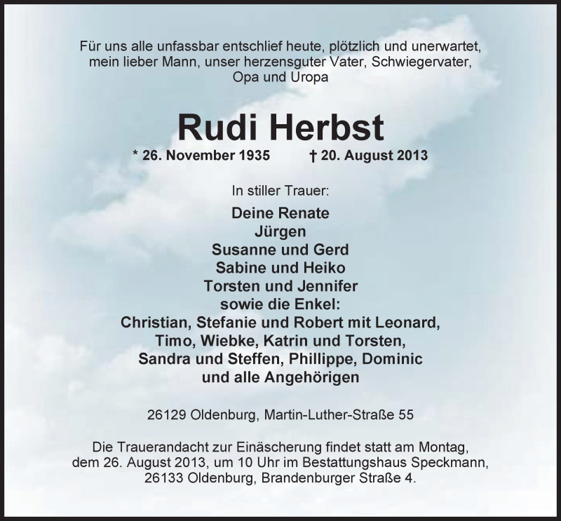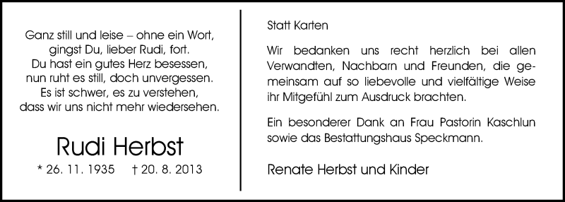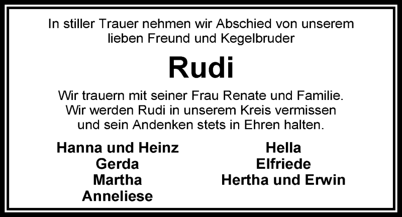 Hier finden Sie alle Traueranzeigen aus der Zeitung, die bisher für Rudi Herbst erschienen sind. Weitere Traueranzeigen, die in der Zeitung erscheinen, werden hier ebenfalls aufgelistet