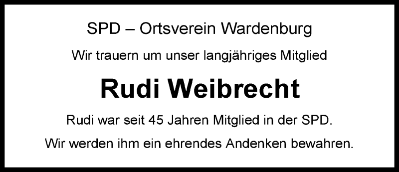 Hier finden Sie alle Traueranzeigen aus der Zeitung, die bisher für Rudi Weibrecht erschienen sind. Weitere Traueranzeigen, die in der Zeitung erscheinen, werden hier ebenfalls aufgelistet