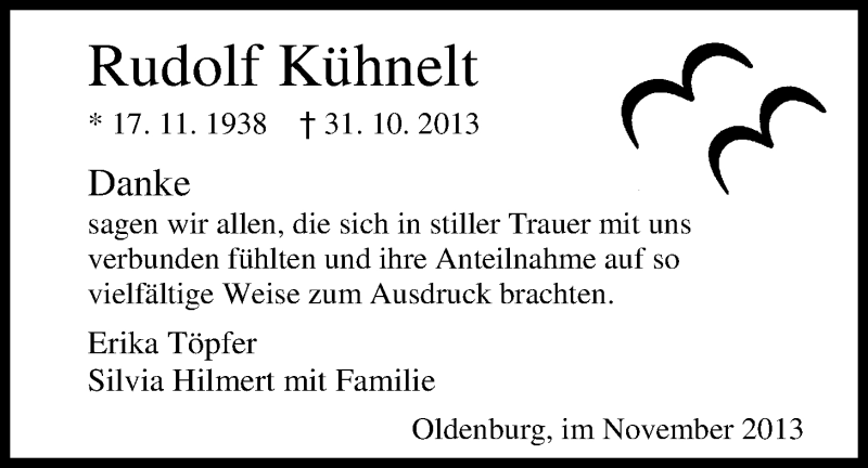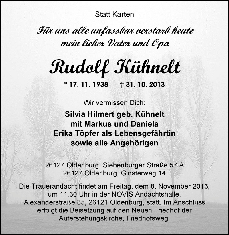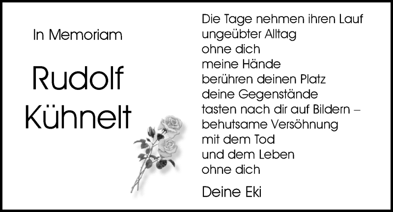 Hier finden Sie alle Traueranzeigen aus der Zeitung, die bisher für Rudolf Kühnelt erschienen sind. Weitere Traueranzeigen, die in der Zeitung erscheinen, werden hier ebenfalls aufgelistet