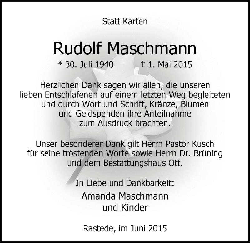 Hier finden Sie alle Traueranzeigen aus der Zeitung, die bisher für Rudolf Maschmann erschienen sind. Weitere Traueranzeigen, die in der Zeitung erscheinen, werden hier ebenfalls aufgelistet