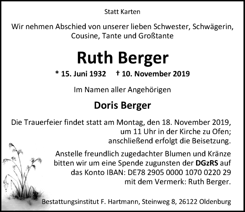 Hier finden Sie alle Traueranzeigen aus der Zeitung, die bisher für Ruth Berger erschienen sind. Weitere Traueranzeigen, die in der Zeitung erscheinen, werden hier ebenfalls aufgelistet