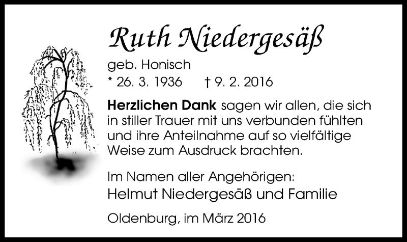 Hier finden Sie alle Traueranzeigen aus der Zeitung, die bisher für Ruth Niedergesäß erschienen sind. Weitere Traueranzeigen, die in der Zeitung erscheinen, werden hier ebenfalls aufgelistet