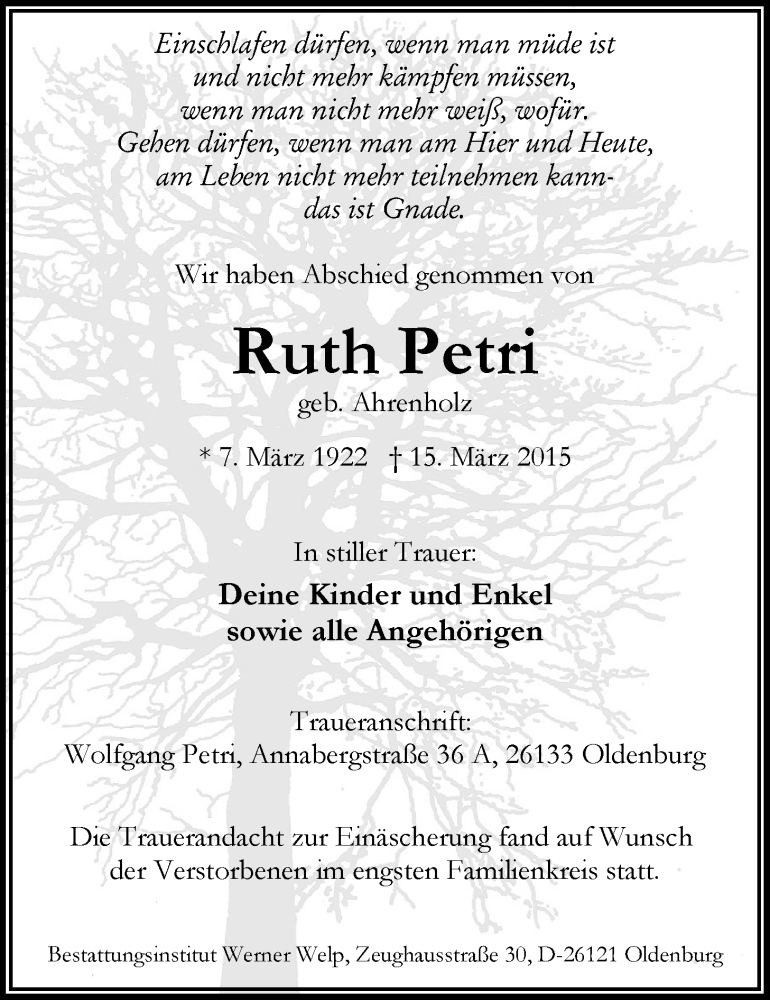 Hier finden Sie alle Traueranzeigen aus der Zeitung, die bisher für Ruth Petri erschienen sind. Weitere Traueranzeigen, die in der Zeitung erscheinen, werden hier ebenfalls aufgelistet