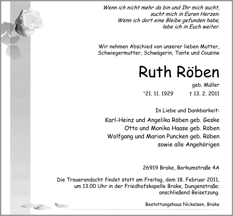 Hier finden Sie alle Traueranzeigen aus der Zeitung, die bisher für Ruth Röben erschienen sind. Weitere Traueranzeigen, die in der Zeitung erscheinen, werden hier ebenfalls aufgelistet