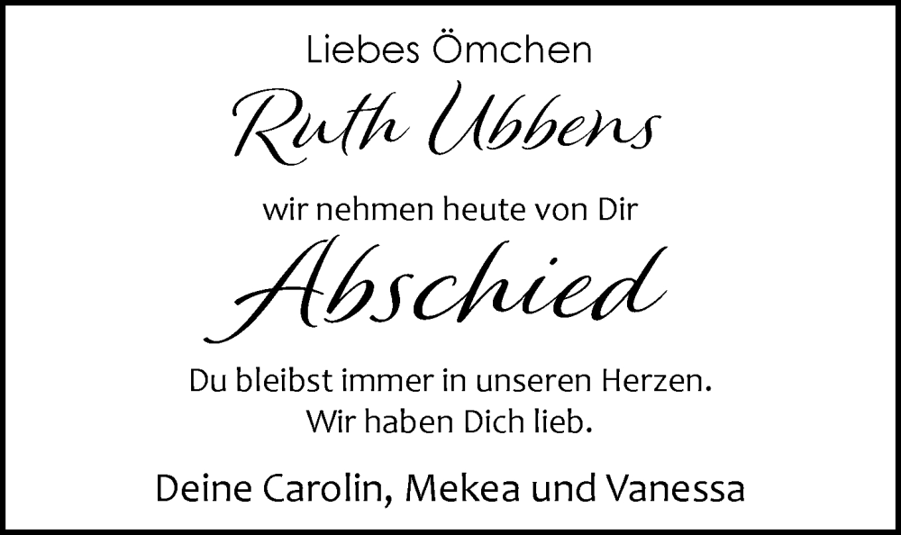 Hier finden Sie alle Traueranzeigen aus der Zeitung, die bisher für Ruth Ubbens erschienen sind. Weitere Traueranzeigen, die in der Zeitung erscheinen, werden hier ebenfalls aufgelistet