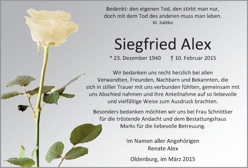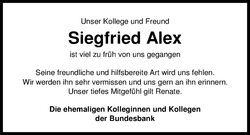 Hier finden Sie alle Traueranzeigen aus der Zeitung, die bisher für Siegfried Alex erschienen sind. Weitere Traueranzeigen, die in der Zeitung erscheinen, werden hier ebenfalls aufgelistet