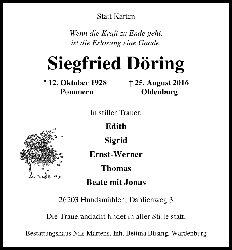 Hier finden Sie alle Traueranzeigen aus der Zeitung, die bisher für Siegfried Döring erschienen sind. Weitere Traueranzeigen, die in der Zeitung erscheinen, werden hier ebenfalls aufgelistet