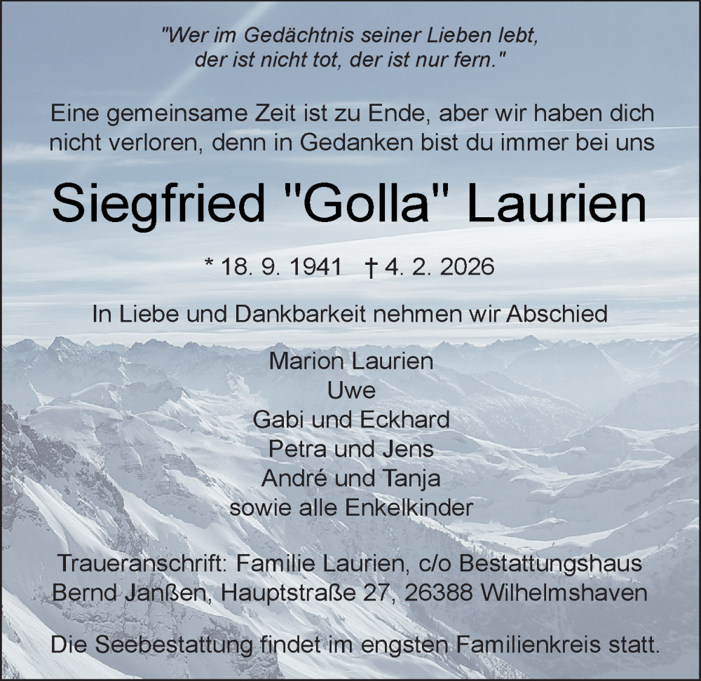 Hier finden Sie alle Traueranzeigen aus der Zeitung, die bisher für Siegfried Laurien erschienen sind. Weitere Traueranzeigen, die in der Zeitung erscheinen, werden hier ebenfalls aufgelistet