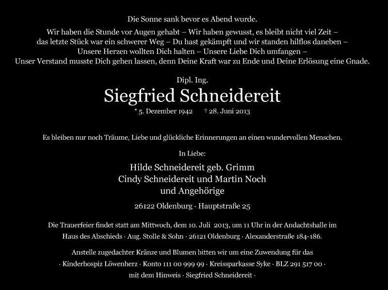 Hier finden Sie alle Traueranzeigen aus der Zeitung, die bisher für Siegfried Schneidereit erschienen sind. Weitere Traueranzeigen, die in der Zeitung erscheinen, werden hier ebenfalls aufgelistet
