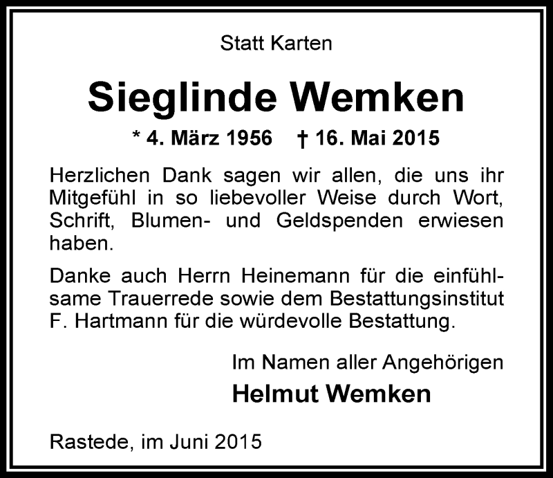 Hier finden Sie alle Traueranzeigen aus der Zeitung, die bisher für Sieglinde Wemken erschienen sind. Weitere Traueranzeigen, die in der Zeitung erscheinen, werden hier ebenfalls aufgelistet