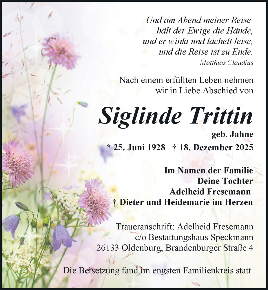 Hier finden Sie alle Traueranzeigen aus der Zeitung, die bisher für Siglinde Trittin erschienen sind. Weitere Traueranzeigen, die in der Zeitung erscheinen, werden hier ebenfalls aufgelistet