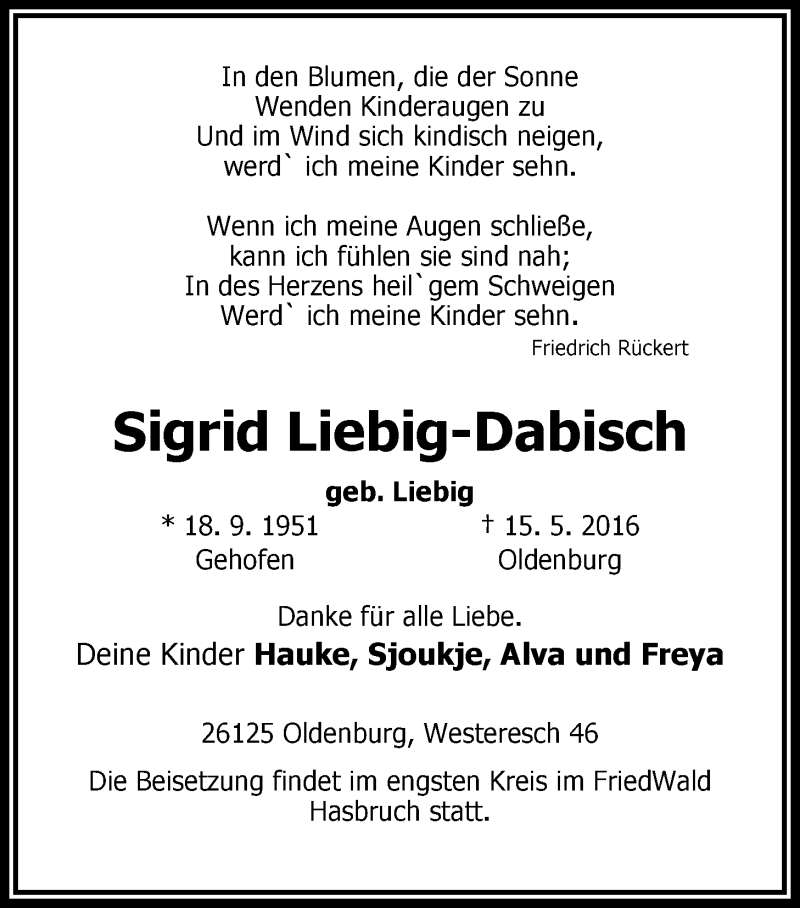 Hier finden Sie alle Traueranzeigen aus der Zeitung, die bisher für Sigrid Liebig-Dabisch erschienen sind. Weitere Traueranzeigen, die in der Zeitung erscheinen, werden hier ebenfalls aufgelistet