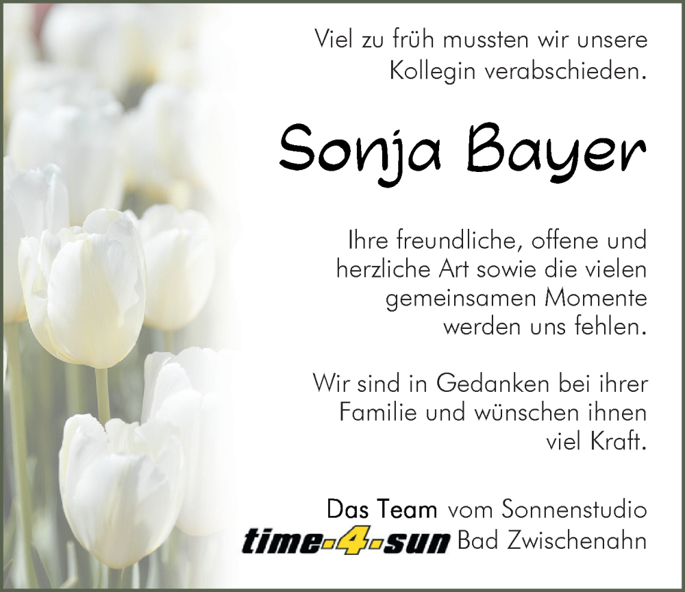 Hier finden Sie alle Traueranzeigen aus der Zeitung, die bisher für Sonja Bayer erschienen sind. Weitere Traueranzeigen, die in der Zeitung erscheinen, werden hier ebenfalls aufgelistet