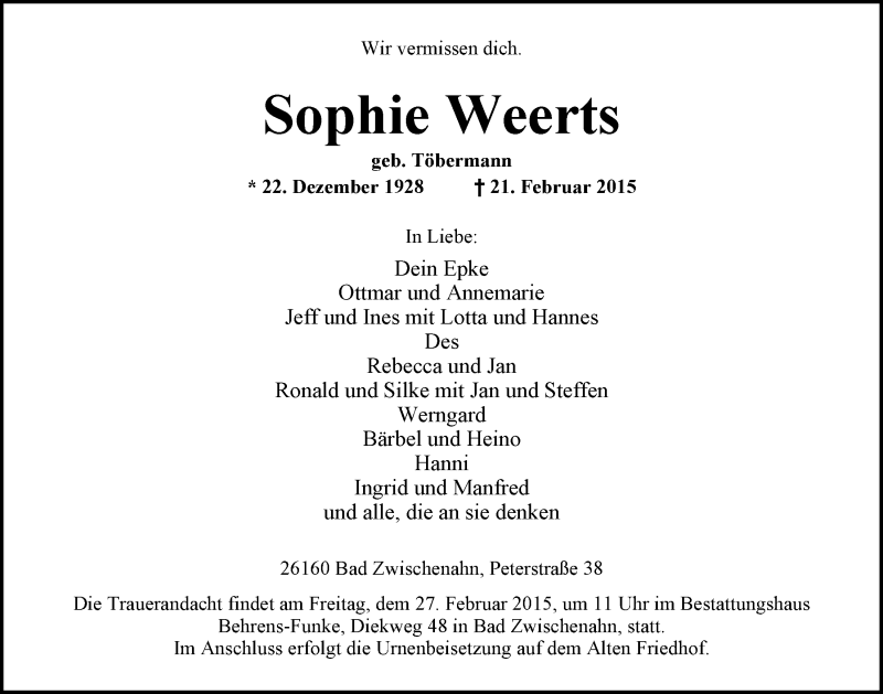 Hier finden Sie alle Traueranzeigen aus der Zeitung, die bisher für Sophie Weerts erschienen sind. Weitere Traueranzeigen, die in der Zeitung erscheinen, werden hier ebenfalls aufgelistet