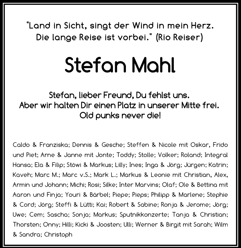 Hier finden Sie alle Traueranzeigen aus der Zeitung, die bisher für Stefan Mahl erschienen sind. Weitere Traueranzeigen, die in der Zeitung erscheinen, werden hier ebenfalls aufgelistet