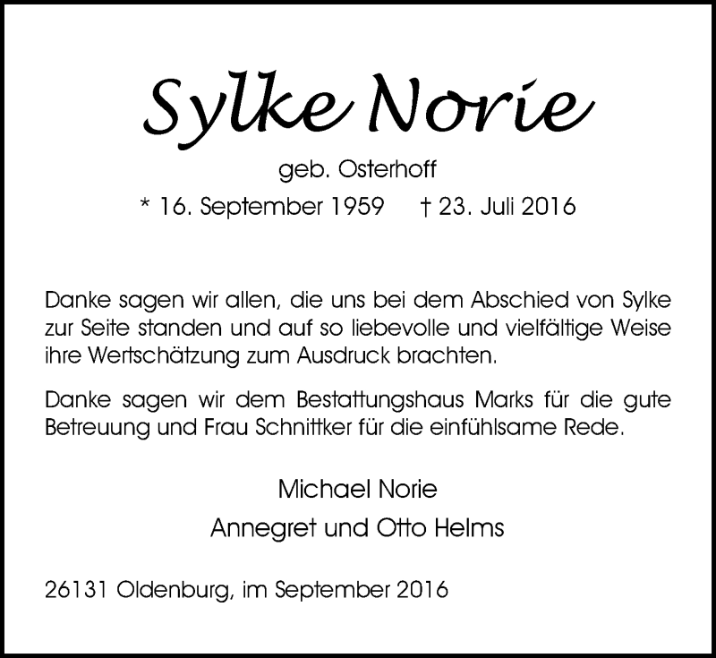 Hier finden Sie alle Traueranzeigen aus der Zeitung, die bisher für Sylke Norie erschienen sind. Weitere Traueranzeigen, die in der Zeitung erscheinen, werden hier ebenfalls aufgelistet