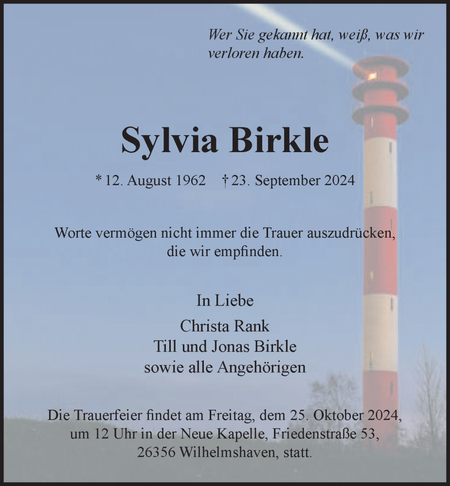 Hier finden Sie alle Traueranzeigen aus der Zeitung, die bisher für Sylvia Birkle erschienen sind. Weitere Traueranzeigen, die in der Zeitung erscheinen, werden hier ebenfalls aufgelistet