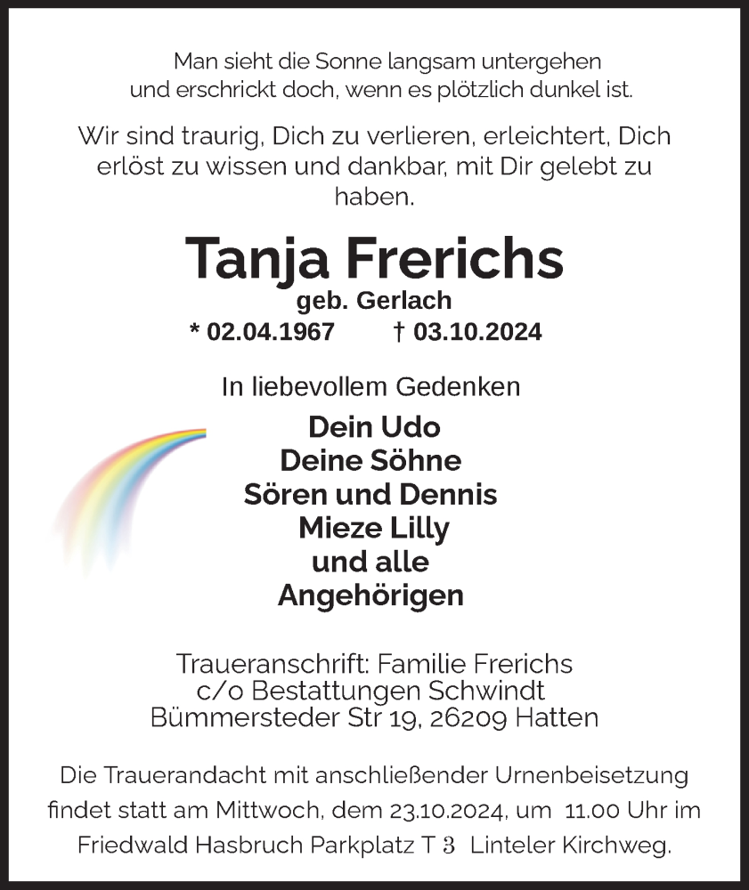 Hier finden Sie alle Traueranzeigen aus der Zeitung, die bisher für Tanja Frerichs erschienen sind. Weitere Traueranzeigen, die in der Zeitung erscheinen, werden hier ebenfalls aufgelistet