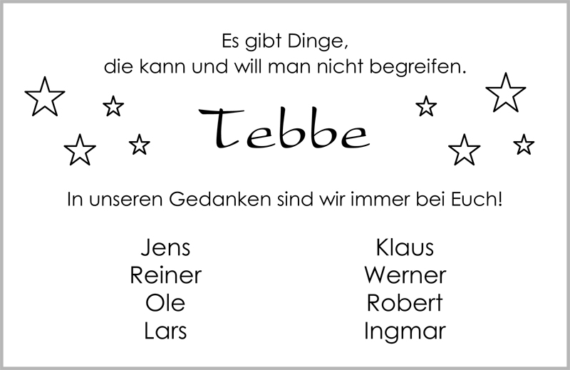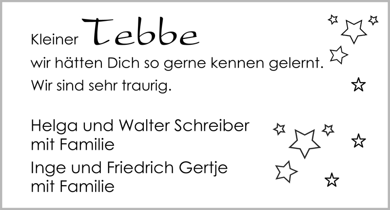 Hier finden Sie alle Traueranzeigen aus der Zeitung, die bisher für Tebbe Schreiber erschienen sind. Weitere Traueranzeigen, die in der Zeitung erscheinen, werden hier ebenfalls aufgelistet