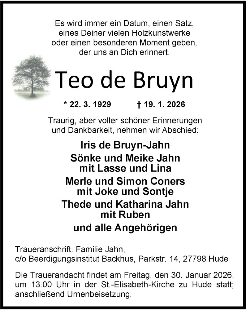 Hier finden Sie alle Traueranzeigen aus der Zeitung, die bisher für Teo de Bruyn erschienen sind. Weitere Traueranzeigen, die in der Zeitung erscheinen, werden hier ebenfalls aufgelistet