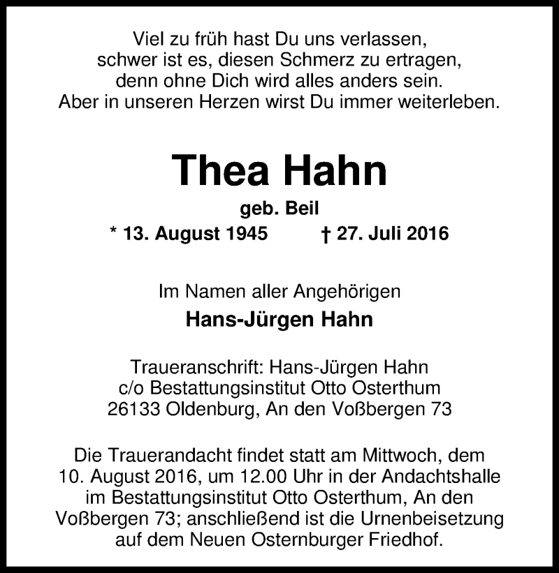 Hier finden Sie alle Traueranzeigen aus der Zeitung, die bisher für Thea Hahn erschienen sind. Weitere Traueranzeigen, die in der Zeitung erscheinen, werden hier ebenfalls aufgelistet