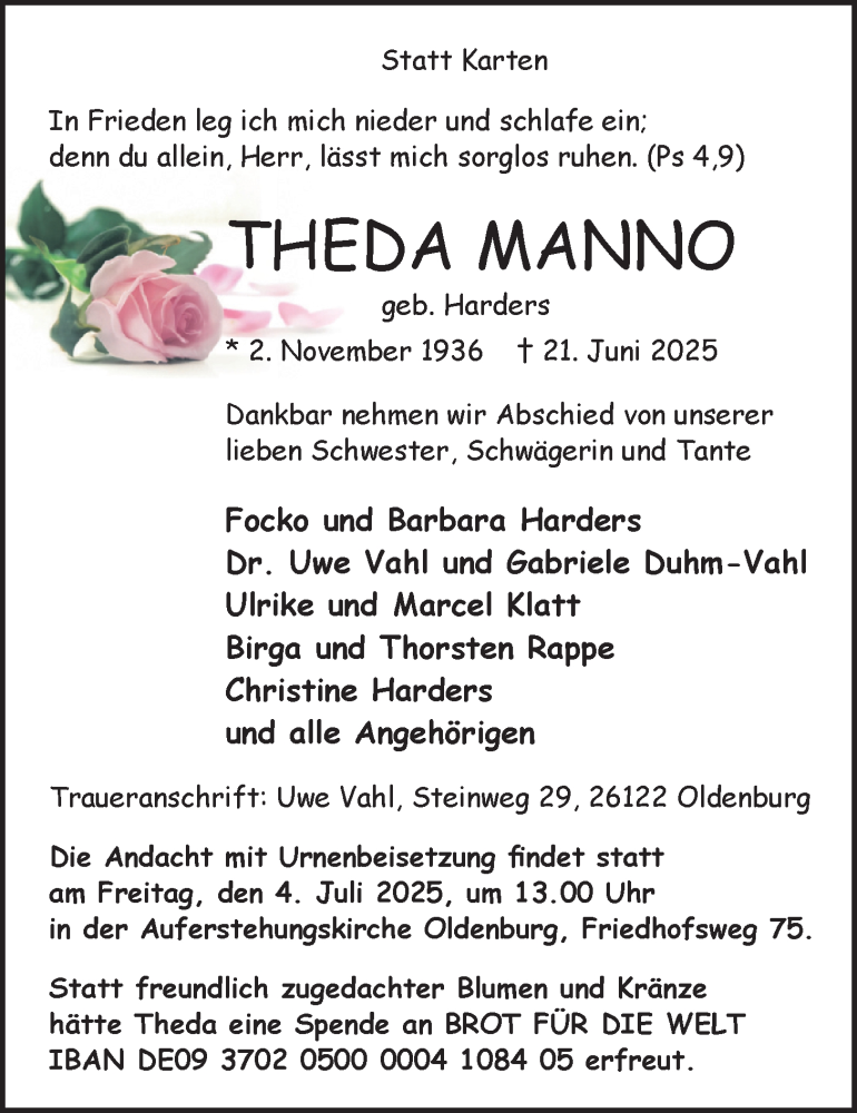 Hier finden Sie alle Traueranzeigen aus der Zeitung, die bisher für Theda Manno erschienen sind. Weitere Traueranzeigen, die in der Zeitung erscheinen, werden hier ebenfalls aufgelistet