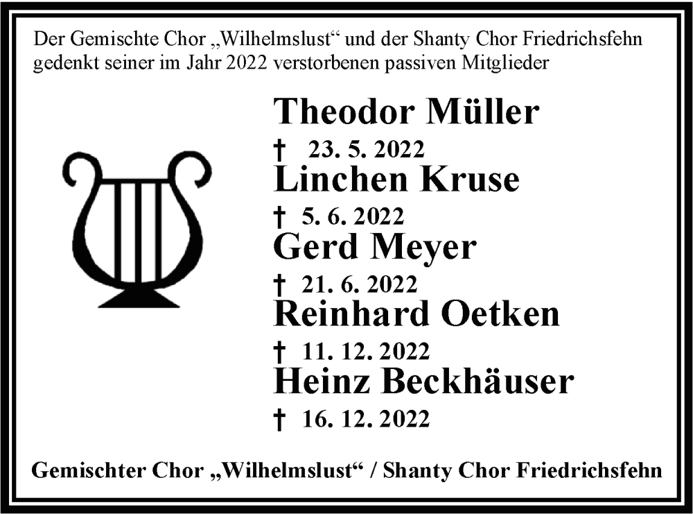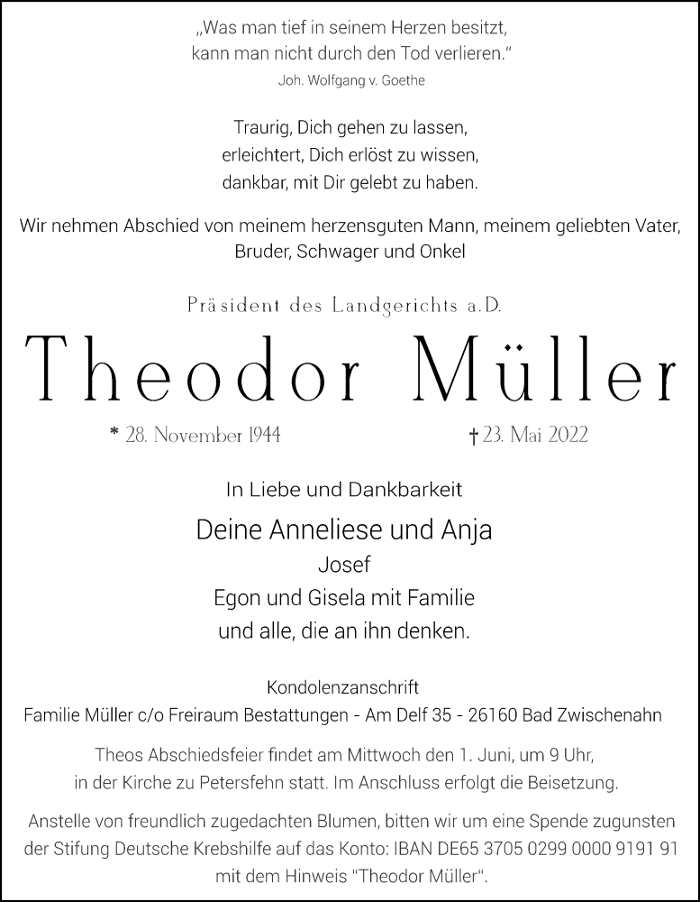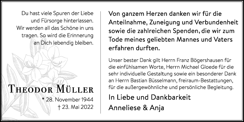 Hier finden Sie alle Traueranzeigen aus der Zeitung, die bisher für Theodor Müller erschienen sind. Weitere Traueranzeigen, die in der Zeitung erscheinen, werden hier ebenfalls aufgelistet