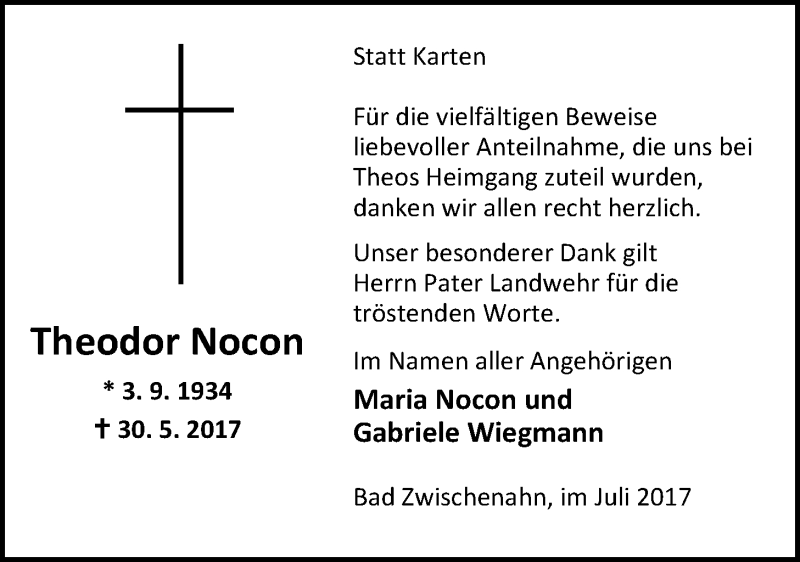 Hier finden Sie alle Traueranzeigen aus der Zeitung, die bisher für Theodor Nocon erschienen sind. Weitere Traueranzeigen, die in der Zeitung erscheinen, werden hier ebenfalls aufgelistet