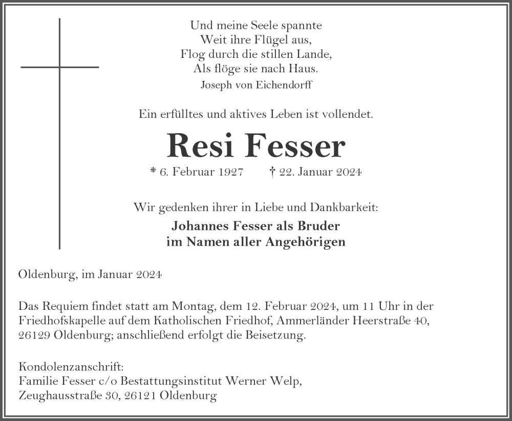 Hier finden Sie alle Traueranzeigen aus der Zeitung, die bisher für Therese (Resi) Fesser erschienen sind. Weitere Traueranzeigen, die in der Zeitung erscheinen, werden hier ebenfalls aufgelistet