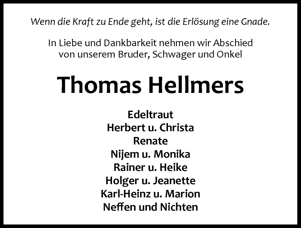 Hier finden Sie alle Traueranzeigen aus der Zeitung, die bisher für Thomas Hellmers erschienen sind. Weitere Traueranzeigen, die in der Zeitung erscheinen, werden hier ebenfalls aufgelistet