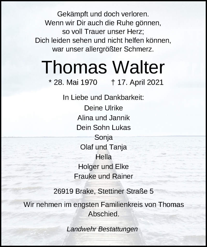 Hier finden Sie alle Traueranzeigen aus der Zeitung, die bisher für Thomas Walter erschienen sind. Weitere Traueranzeigen, die in der Zeitung erscheinen, werden hier ebenfalls aufgelistet