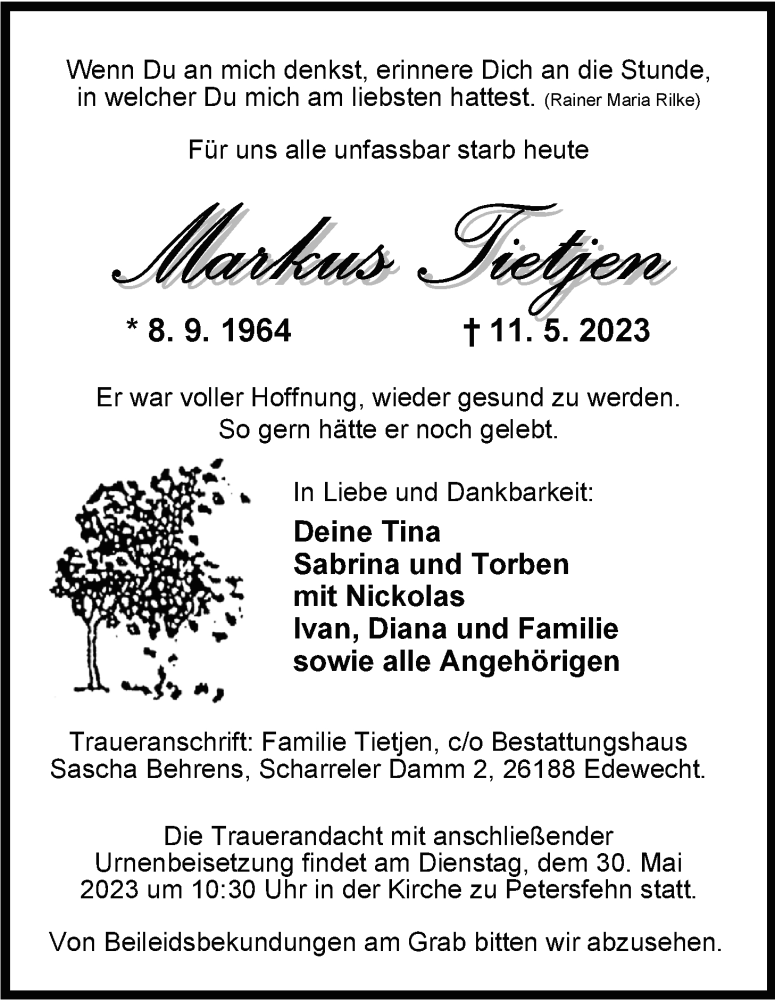 Hier finden Sie alle Traueranzeigen aus der Zeitung, die bisher für Tietjen Markus erschienen sind. Weitere Traueranzeigen, die in der Zeitung erscheinen, werden hier ebenfalls aufgelistet