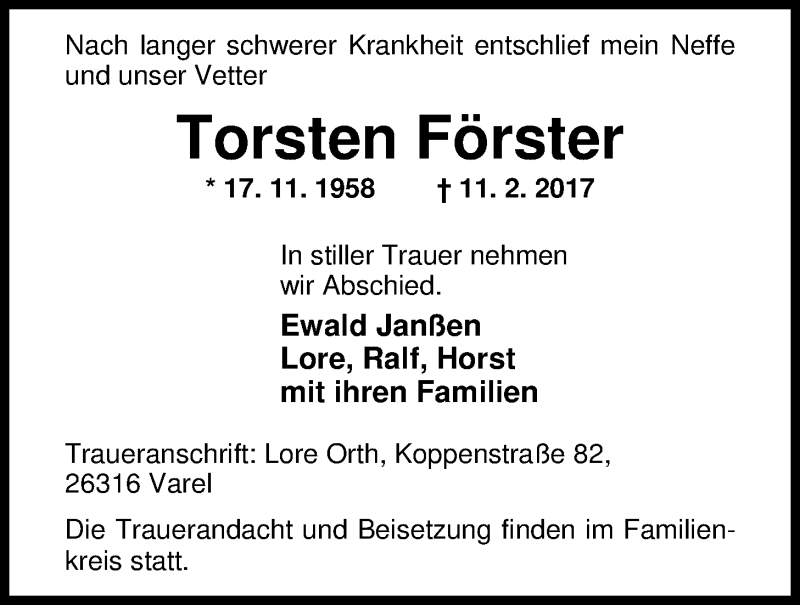 Hier finden Sie alle Traueranzeigen aus der Zeitung, die bisher für Torsten Förster erschienen sind. Weitere Traueranzeigen, die in der Zeitung erscheinen, werden hier ebenfalls aufgelistet