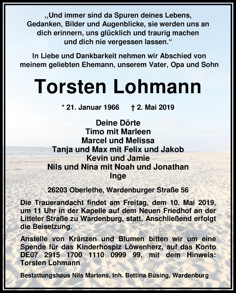 Hier finden Sie alle Traueranzeigen aus der Zeitung, die bisher für Torsten Lohmann erschienen sind. Weitere Traueranzeigen, die in der Zeitung erscheinen, werden hier ebenfalls aufgelistet
