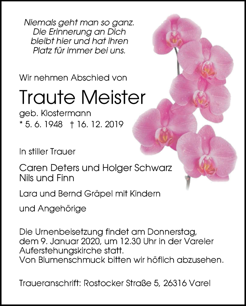 Hier finden Sie alle Traueranzeigen aus der Zeitung, die bisher für Traute Meister erschienen sind. Weitere Traueranzeigen, die in der Zeitung erscheinen, werden hier ebenfalls aufgelistet