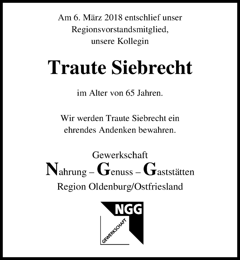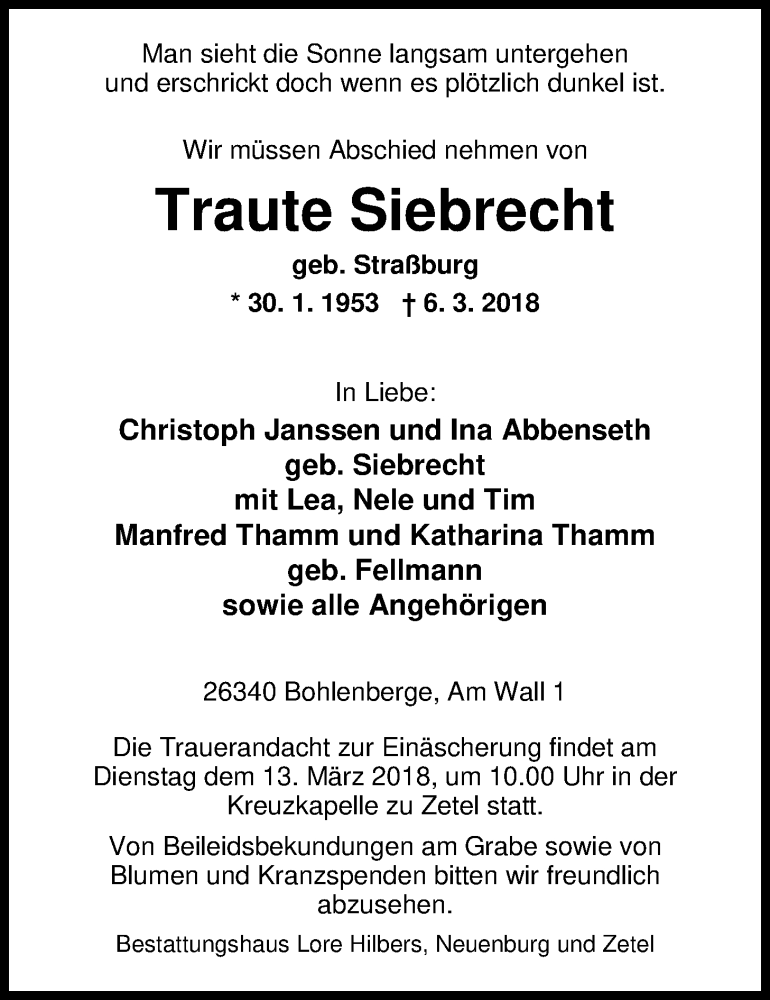 Hier finden Sie alle Traueranzeigen aus der Zeitung, die bisher für Traute Siebrecht erschienen sind. Weitere Traueranzeigen, die in der Zeitung erscheinen, werden hier ebenfalls aufgelistet